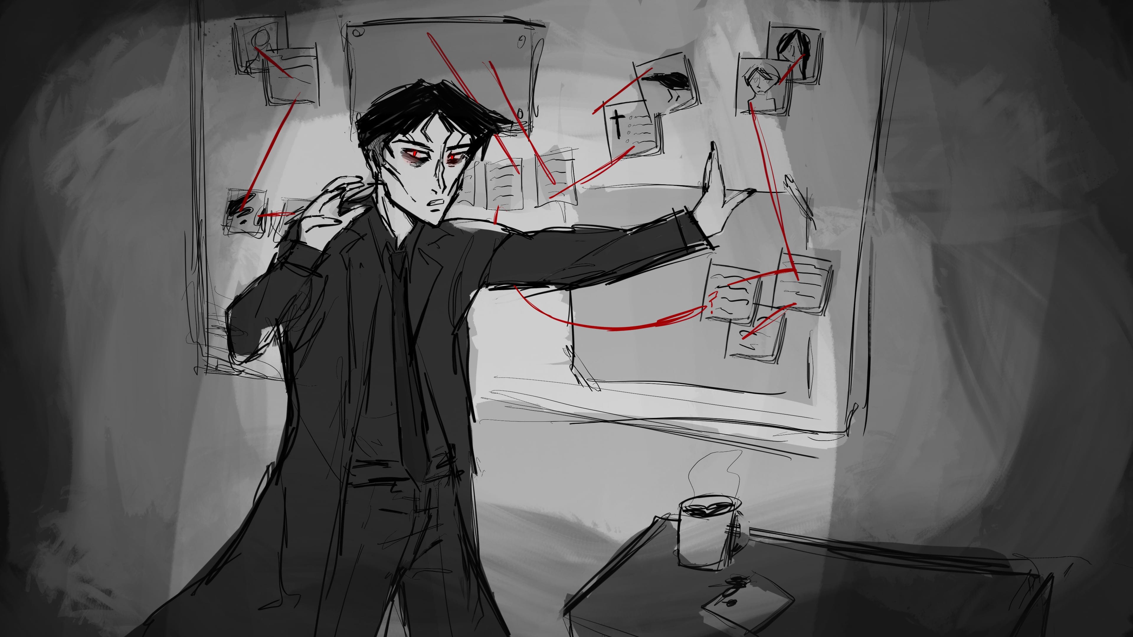 Viktor sets up a murder board in his apartment and reviews the case so far. What starts with coffee and a handful of sticky notes spirals into a wall-sized web of deaths, a missing kid, and one very talkative ghost. From Olivia’s murder to Klaus’s ditchwater demise, Viktor traces the connections with dry commentary and growing dread. Chai’s not in his head anymore, so he’s finally alone—with the truth.