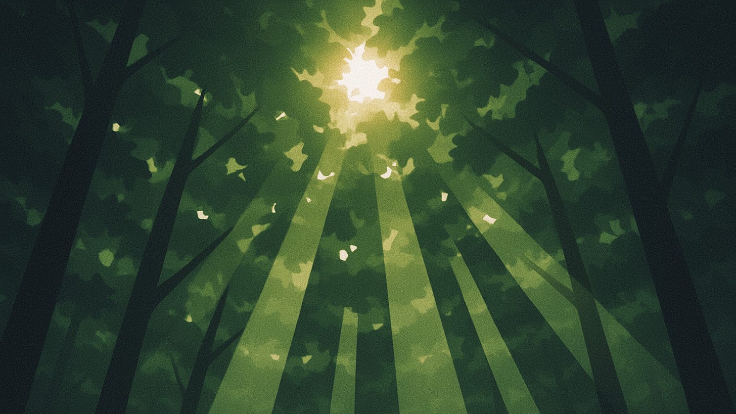 I started to walk yet again. Why pick a direction? I just put one foot in front of the other, tripping over roots every step. The canopy above was thick, strangling the sunlight into narrow shafts. There wasn’t much plant life growing on the forest floor.